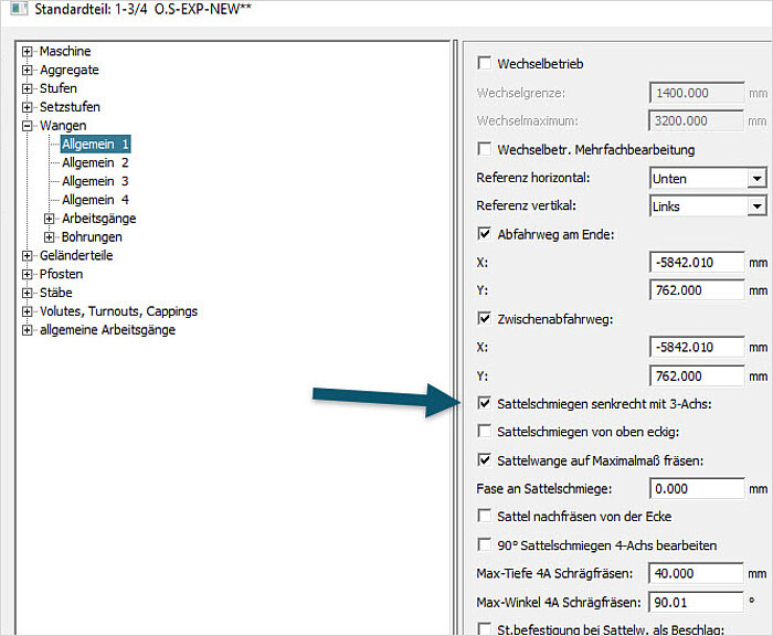 Im angloamerikanischen Raum werden die Sattelwangen teilweise mit einer 45°-Schmiege mit den Setzstufen verbunden. In der Software ist es nun möglich, diese Verbindung mit zwei Arbeitsgängen passend zu (dünneren) Setzstufen zu erstellen. Im ersten Schritt wird die Wange mit einer 3-Achs-Bearbeitung auf die Stärke der Setzstufe gefräst. Eventuell gewünschte Montageluft kann definiert werden. Im zweiten Arbeitsgang wird die Schmiege mit der Fräserspitze in einem Winkel von 45° in einer Zustellung gefräst. Ein Überfräsen in die Sattelschmiege hinein ist frei einstellbar. Dabei wird auch berücksichtigt, in welche Richtung gefräst werden muss, um ein ausrissfreies Resultat zu erzielen.