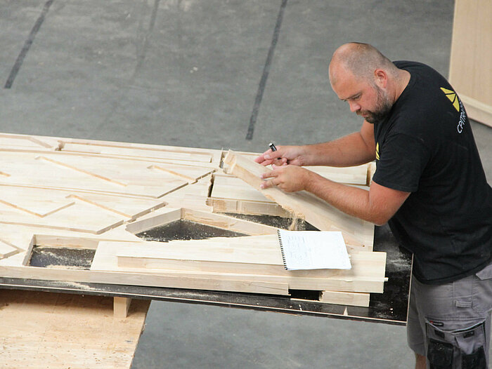 Sobald die Teile auf der Platte optimiert sind, beginnt CPI mit dem einzigartigen Bearbeitungsprozess. Der Maschinentisch wird mit einer wiederverwendbaren Verlustplatte bestückt. Diese Platte wird mit Vakuumsaugern auf der Maschine festgesaugt. Der Bediener belädt dann die Maschine mittels eines Gabelstaplers mit der eigentlichen Massivholzplatte. Die Platte wird auf der Maschine mithilfe eines Lasers anhand der Konturen ausgerichtet. Anschließend befestigt der Maschinenbediener die Massivholzplatte mit normalen Schrauben an der Verlustplatte, damit sie sich während der Produktion nicht bewegt. Nach dem Start des Compass Software CNC-Programms nestet die Maschine die Teile ohne manuellen Eingriff.
