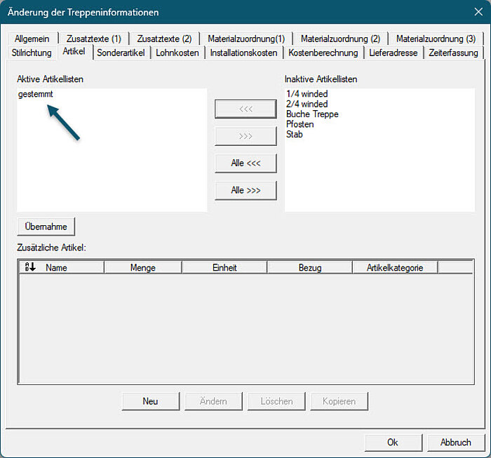 Beim Export einer Treppe im CS Format wurden bisher nur die zugeordneten Artikel, Lohnkosten und Installationskosten exportiert. Wir haben diese Funktion erweitert. Jetzt werden auch aktive Artikellisten, Lohnkostenlisten und Installationskostenlisten incl. ihres Inhalts exportiert.