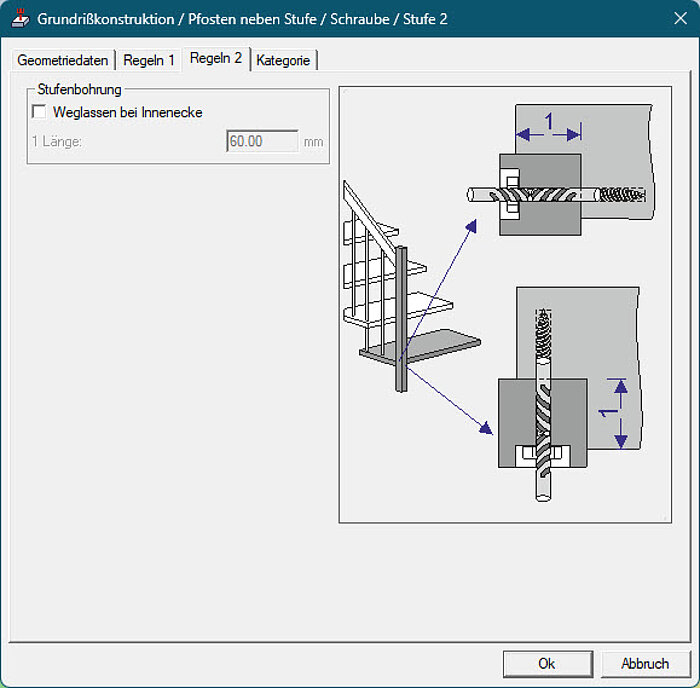 Im Bohrmuster Pfosten neben Stufe wurde eine Regel erweitert. Wir können jetzt die Bohrung in der Stufenschablone unterdrücken. Geprüft wird hier die Länge einer Innenecke, die der Pfosten in der Schablone verursacht. Ist diese Ecke in Bohrrichtung länger wie der eingestellte Wert wird die Bohrung in der Stufe nicht ausgegeben und muss von Hand gemacht werden. Die Bohrung im Pfosten bleibt wie gewünscht an der Position.